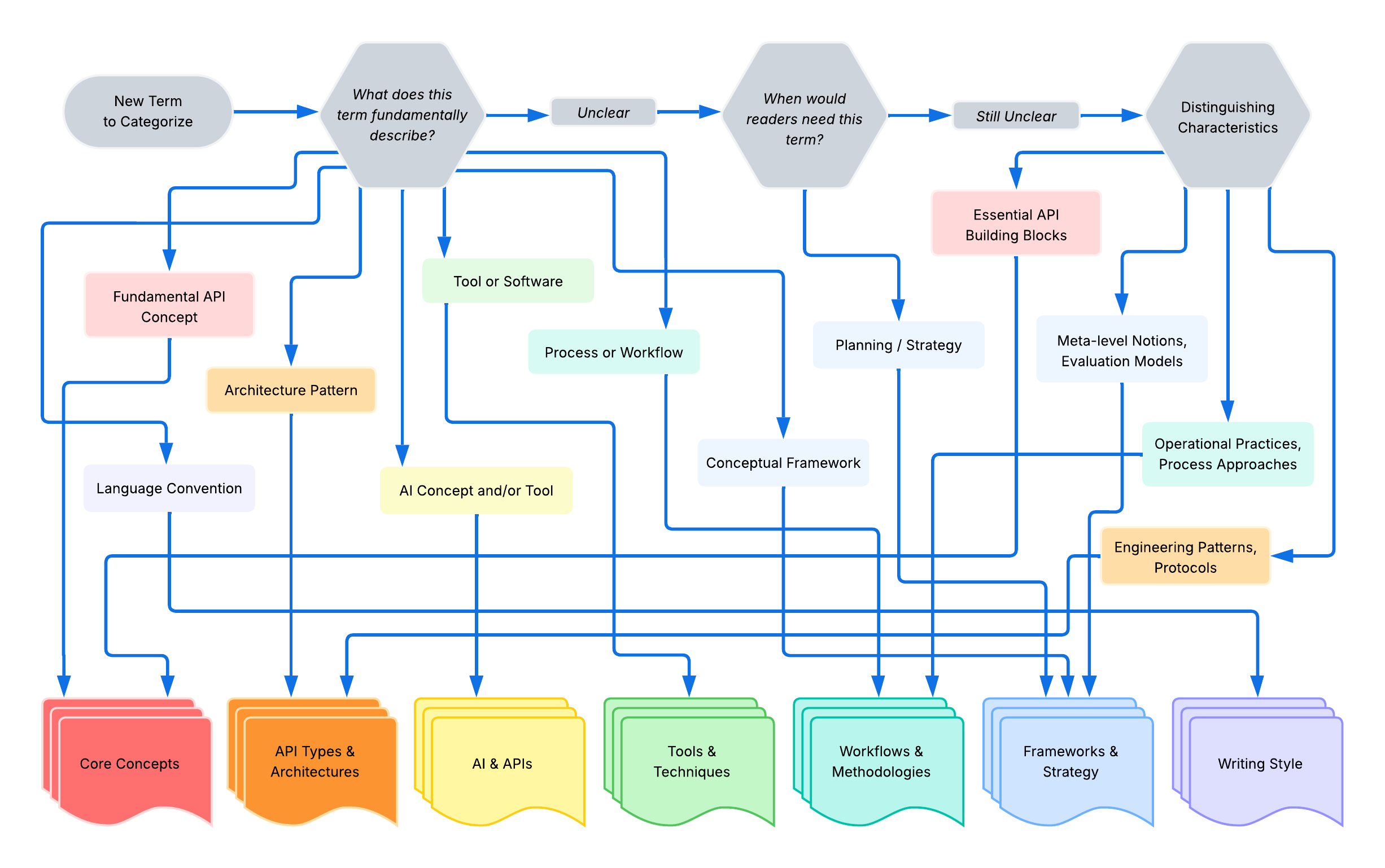 quick-reference.md- common terms, concise definitions/core-concepts- fundamental API documentation conceptsapi-types-architectures.mdx- different architectural patterns and protocolsai-and-apis.mdx- AI technologies, concepts relevant to API documentation/tools-techniques- tools, software, methodsworkflows-methodologies.mdx- development, documentation workflows for API projectsframeworks-strategy.mdx- conceptual models, strategic approaches for API documentation workwriting-style.mdx- language conventions, tone guidelines, rhetorical approaches