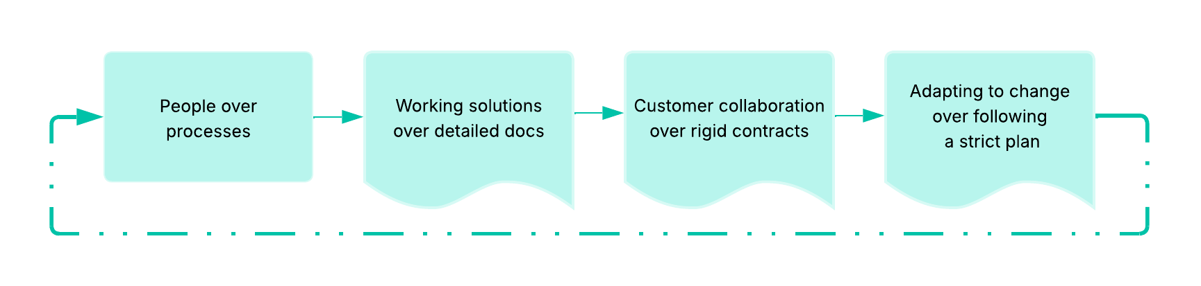 | Agile | Iterative, flexible | Adaptation | Changing requirements, feedback loops |