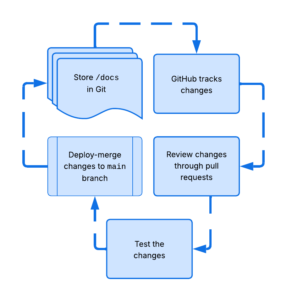 Purpose: enables documentation teams to manage content in version control systems alongside code, leverage developer workflows like pull requests and code review, and automate publishing through CI/CD pipelines; treats documentation files as code artifacts that follow the same quality standards, testing processes, and deployment procedures as software
