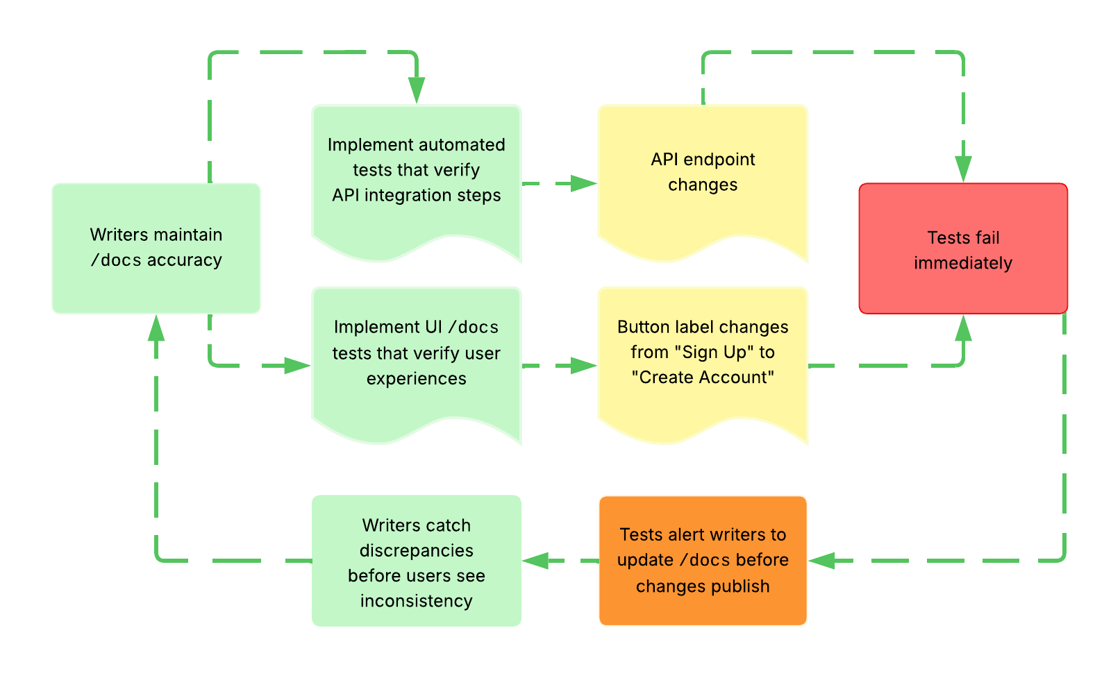 Purpose: maintains documentation accuracy through automated testing that validates docs work as written by directly testing against product UIs, APIs, and CLIs; catches documentation and product issues before users encounter them while reducing manual maintenance effort in environments with frequent product updates; enables technical writers to identify breaking changes in products before release, like how developers use automated tests to catch code regressions